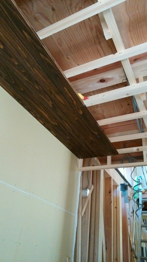 前回アップした塗装済みの天井羽目板を張っていきます。